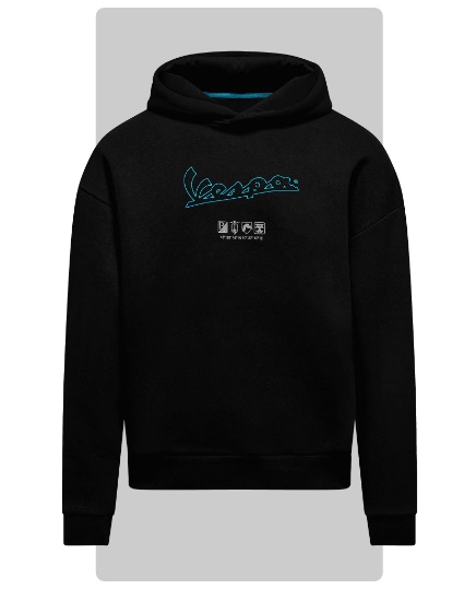 Comfort and warm hoodie made with a soft and brushed cotton fabric. Featuring the iconic Vespa logo and the new Vespa DEC graphics on the front and an exclusive printed label on the inside.