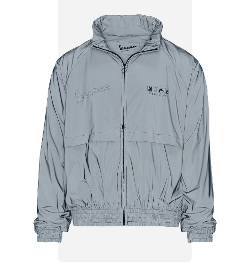 Soft and lightweight wind jacket with a water repellent treatment . The jacket is personalized with the Vespa logo and the new Vespa DEC graphics that refer to the history of the brand. It features a breathable, same-tone mesh lining for added comfort. There is an invisible zip in the neck from which the hood can be pulled out. A new-look internal printed label is just one example of the meticulous detail that lifts this jacket out of the ordinary. The blade color is made with a reflective fabric.
