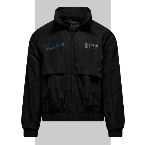 Soft and lightweight wind jacket with a water repellent treatment . The jacket is personalized with the Vespa logo and the new Vespa DEC graphics that refer to the history of the brand. It features a breathable, same-tone mesh lining for added comfort. There is an invisible zip in the neck from which the hood can be pulled out. A new-look internal printed label is just one example of the meticulous detail that lifts this jacket out of the ordinary. The blade color is made with a reflective fabric.