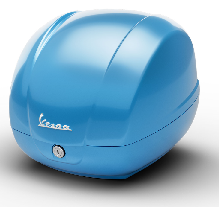 The box is a generous 36 litres and can comfortably accommodate your helmet and gloves or shopping. It comes with two keys and is lockable for security and has a raised chrome Vespa decal fitted. It is the genuine Vespa product.