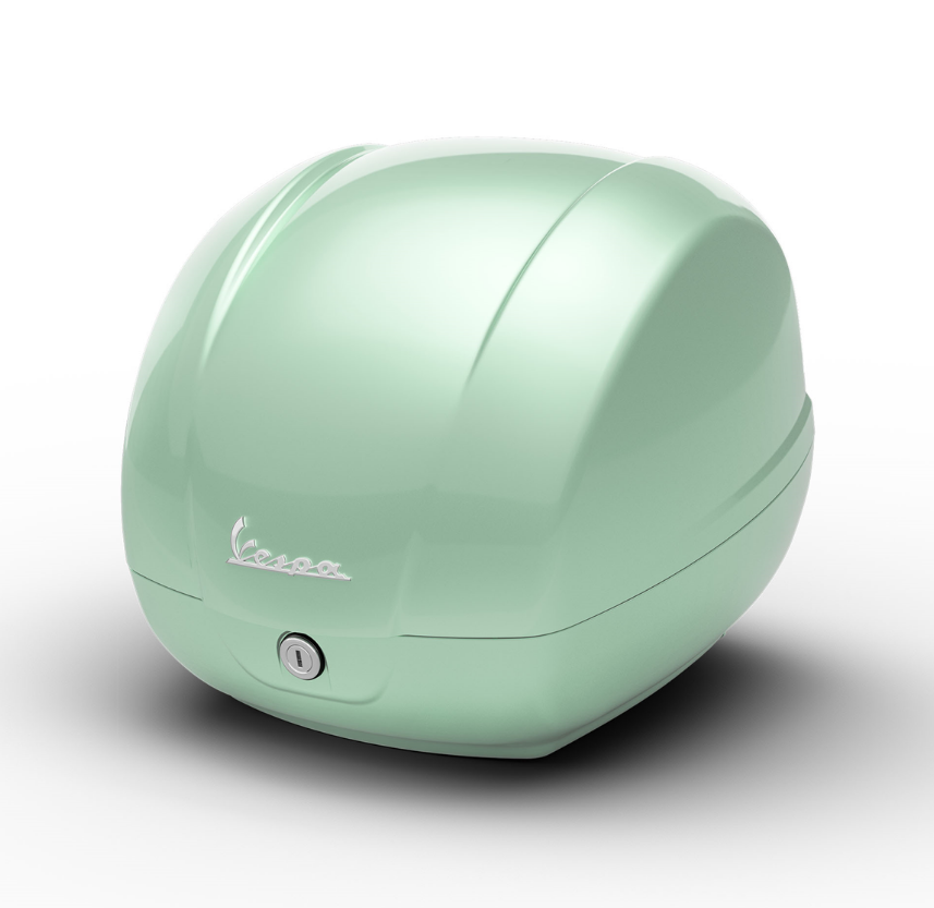 The box is a generous 36 litres and can comfortably accommodate your helmet and gloves or shopping. It comes with two keys and is lockable for security and has a raised chrome Vespa decal fitted. It is the genuine Vespa product.